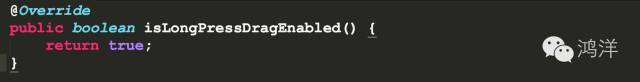 这个方法是为了告诉ItemTouchHelper是否需要RecyclerView支持长按拖拽,默认返回是ture(即支持),理所当然我们要支持,所以我们没有重写,因为默认true。但是这样做是默认全部的item都可以拖拽,怎么实现部分item拖拽呢,查阅isLongPressDragEnabled方法的源码发现,上面的注释上写着: