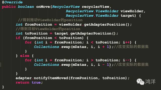 这里的mDatas其实就是Adapter对应的数据集,我们在改变Item位置的同时当然不能忘了数据集需要同步的改变。