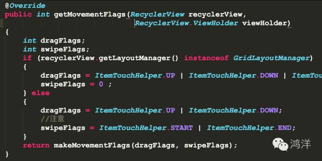 getMovementFlags用于设置是否处理拖拽事件和滑动事件,以及拖拽和滑动操作的方向,有以下两种情况: